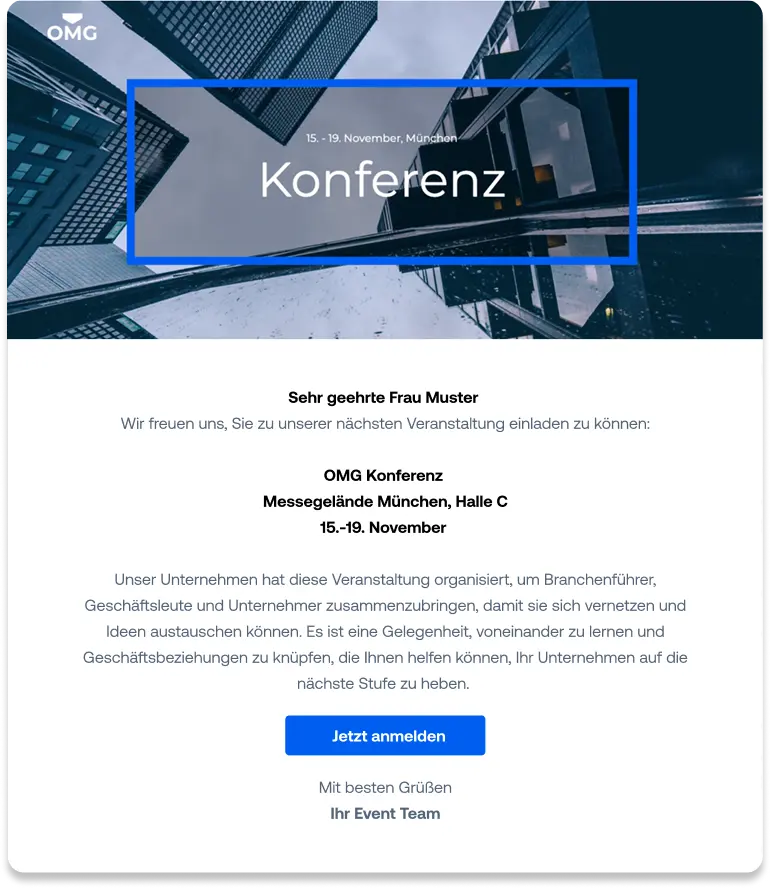 Das Tool für Ihr Einladungsmanagement. Professionelles E-Mail-Marketing rund um Ihre Events. Personalisierte Inhalte und Designs. Mit nur wenigen Klicks zur Event-Einladung.