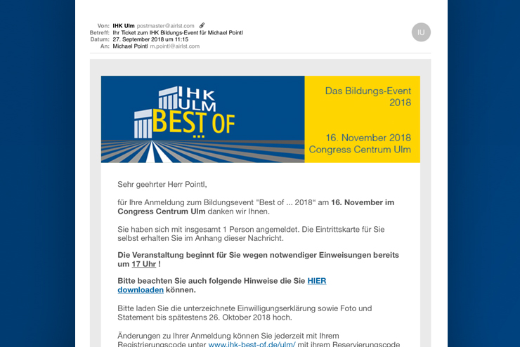 Nachwuchs braucht das Land. Einmal im Jahr würdigt die IHK Ulm Ihre besten Absolventen im Rahmen der Best of… Veranstaltung. Das Teilnehmermanagement für diese Veranstaltung zeichnet sich durch eine hohe Autonomie der Teilnehmer aus. So müssen die Teilnehmer beispielsweise selbst Bilder von sich hochladen, ihre Begleitpersonen definieren und dafür sorgen, dass alle an die notwendigen Informationen der Veranstaltung kommen.