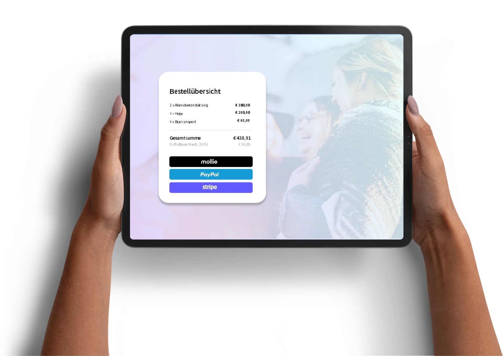 AirLST übernimmt den gesamten Zahlungsprozess – von der Ticketauswahl bis zur automatisierten Rechnungsstellung. Sie verbinden Ihren Zahlungsanbieter einmalig und können sofort mit dem Verkauf starten. Die Erlöse werden direkt auf Ihr Konto überwiesen.